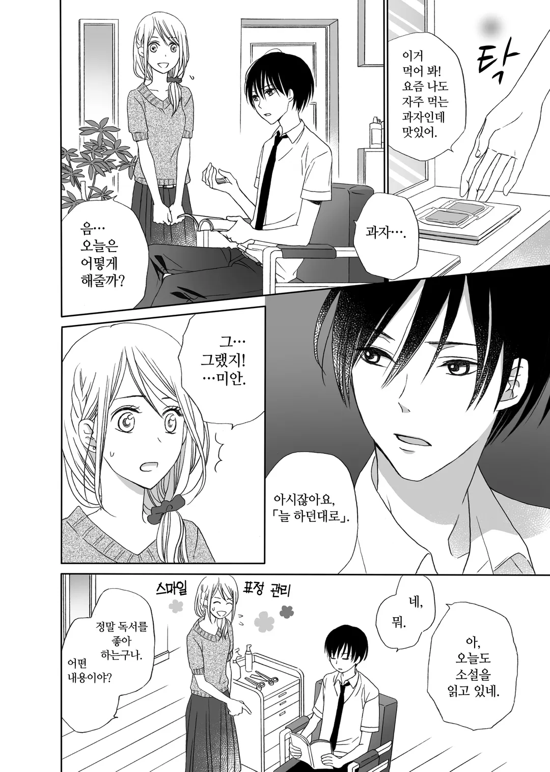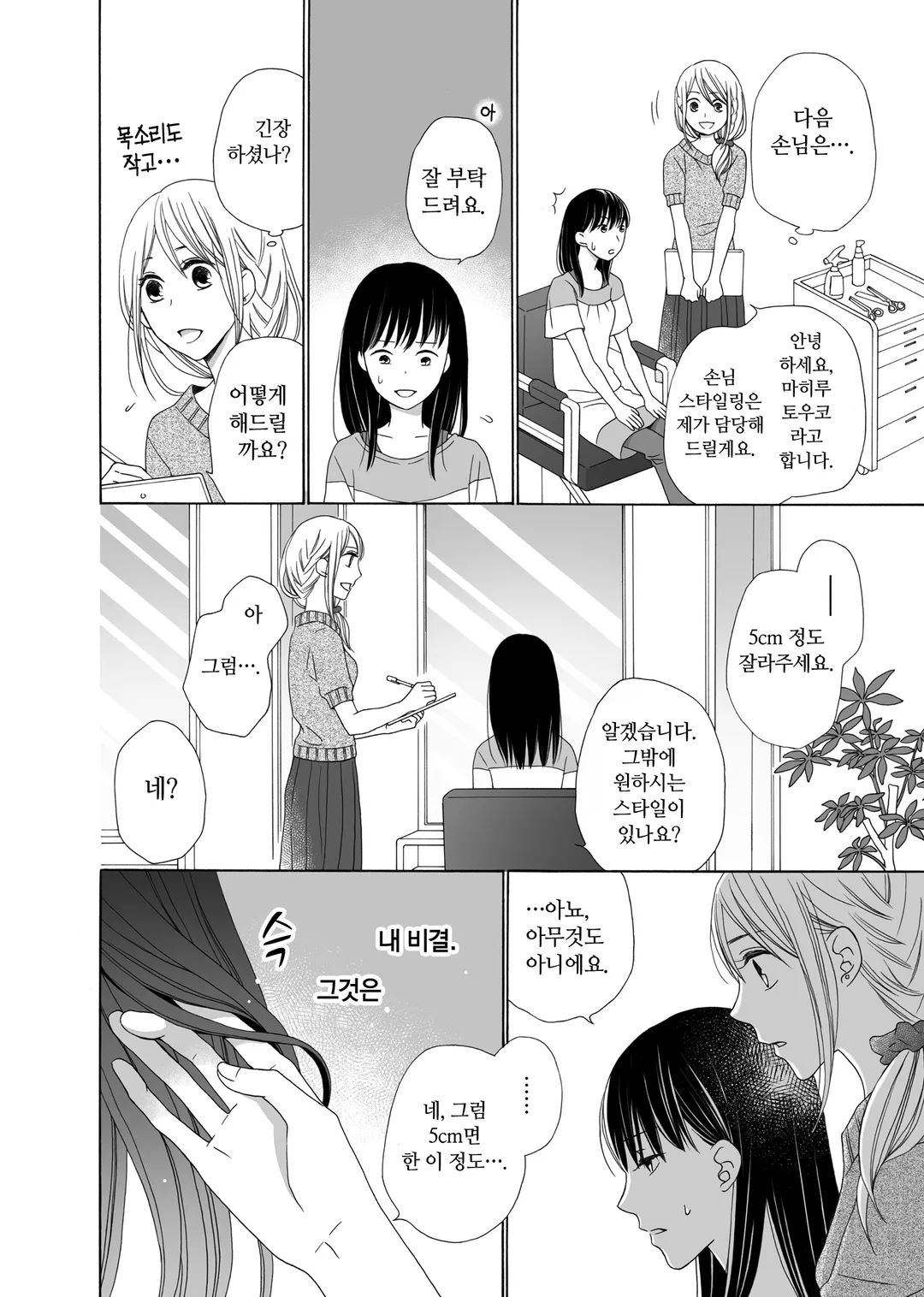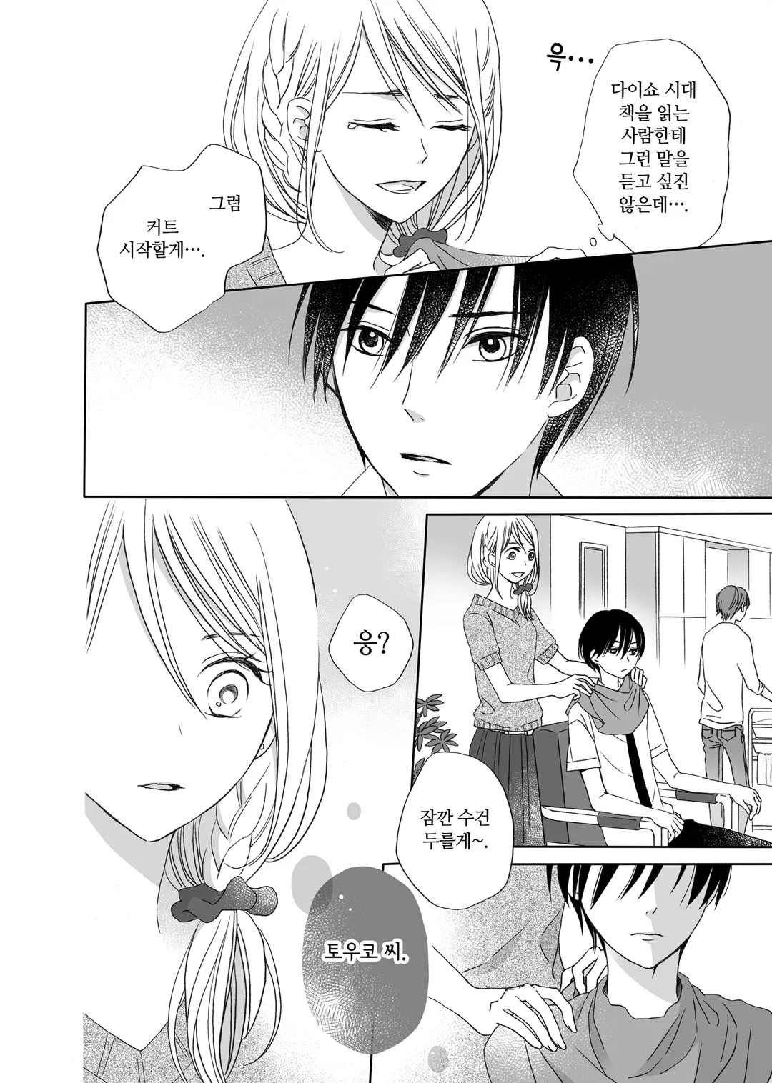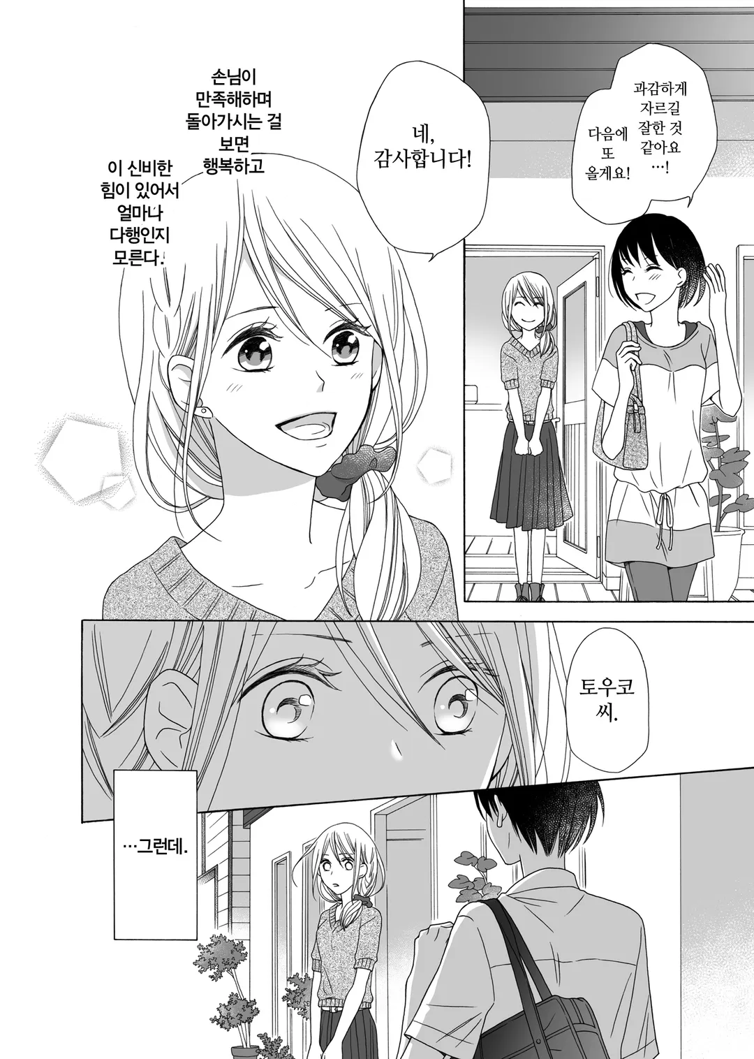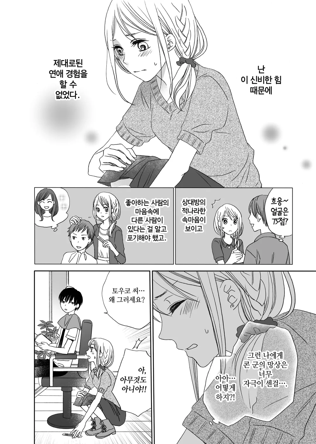 만진 사람의 마음을 알 수 있는 힘 때문에 제대로 된 연애를 해본 적 없는 미용사, 토우코.