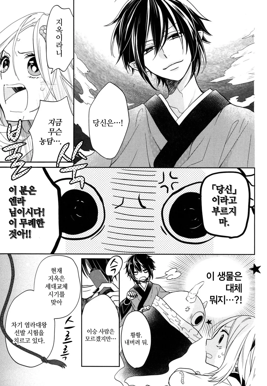 그런 그녀의 앞에 어느 날 염라대왕의 아들인 엔라가 나타난다.