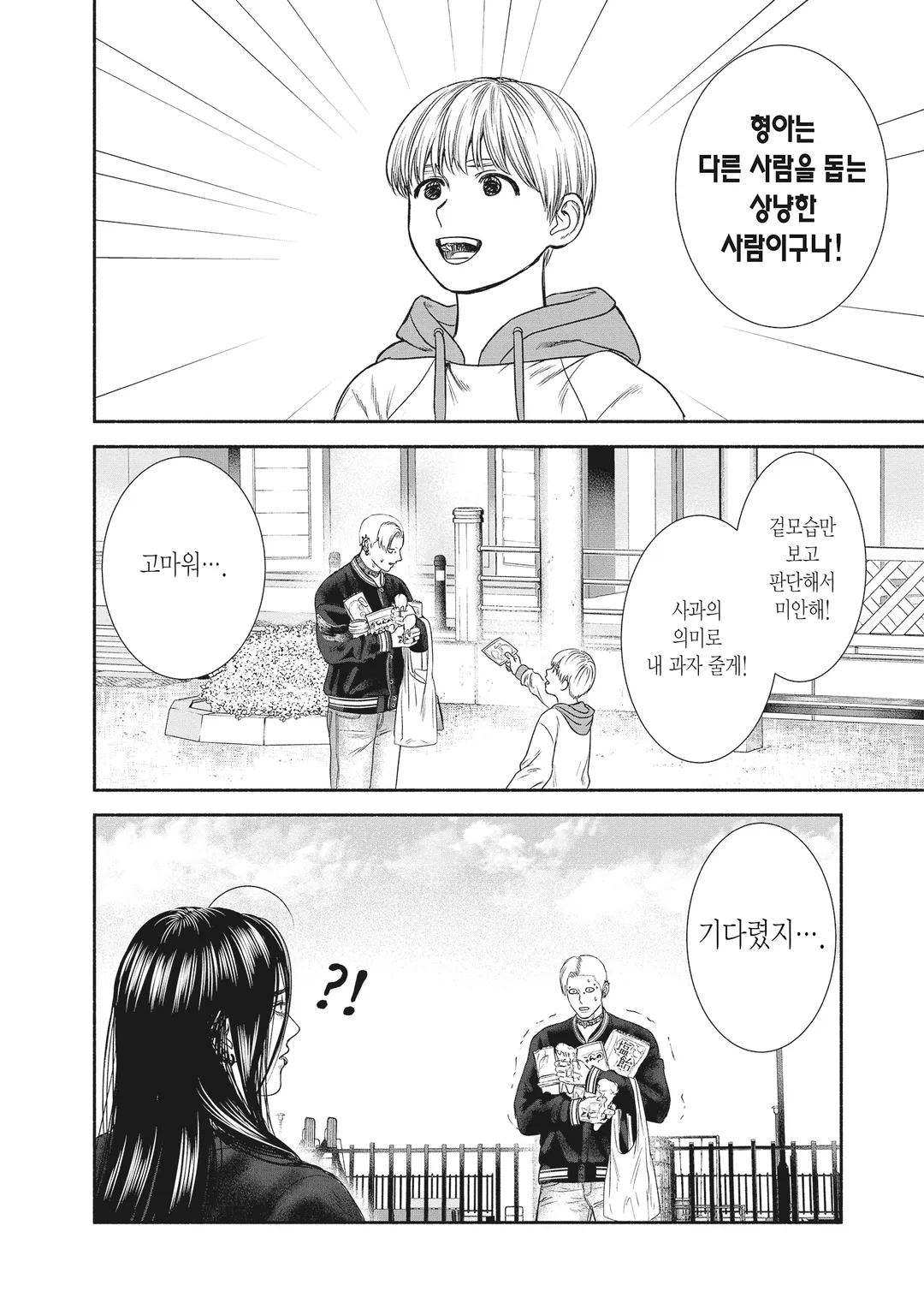 언제나 공원에 출몰하는 수수께끼의 장발과 단발. 보기에도 수상함 만점에 다가가기 어렵지만 버려져 있는 쓰레기를 줍거나 행방불명인 고양이를 찾아주는 등 하는 행동만 보면 선인 그 자체. 어째선지 뱀의 수명이나 토끼의 신체기관에 자세한 장발과 고기만두를 먹고있을 뿐인데 불심검문을 받는 단발. 그러한 두 사람은 마을의 여러 사람들과 얽히며 오늘도 마이페이스로 살고있다. 외견과 내면의 갭이 작렬하는 두 사람에 의한 빈둥빈둥 초현실 코미디!!