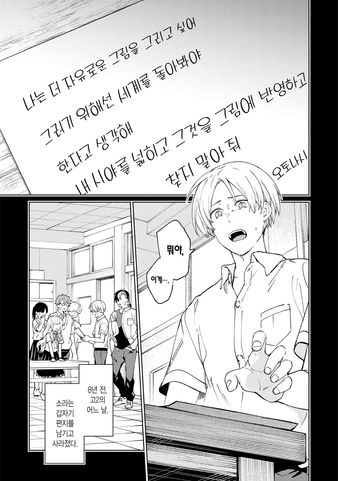 웹디자이너로 일하는 하루사와 히나타는 고2 때 실종된 친구, 오토나시 소라의 시신이 발견됐다는 연락을 받는다. 당시 소라와 같이 들었던 미술부 동료, 하세 부장, 토키와 부부장, 시노하라 선배 등과 함께 장례식에 참석하지만 거기서 소라가 실종 직전에 그리던 그림을 발견하고서 시노하라가 무언가를 깨닫는다. 그러나 시노하라는 누군가에게 살해당하고 히나타도 공격받게 된다. 그림을 지키려고 필사적으로 저항하지만 히나타의 의식은 점점 끊어지고…. 이윽고 다시 눈을 떠 보니 “그날”의 “그곳”이었다ㅡ!! 친구의 실종과 죽음의 진상이란?! 그리고 그림에 숨겨진 비밀이란?! 전율의 타임 리프 서스펜스 개막ㅡ!!