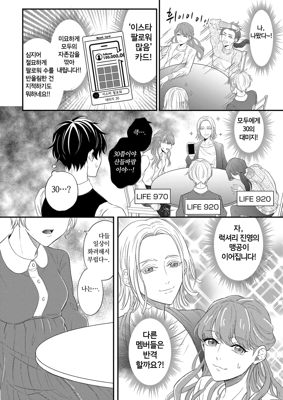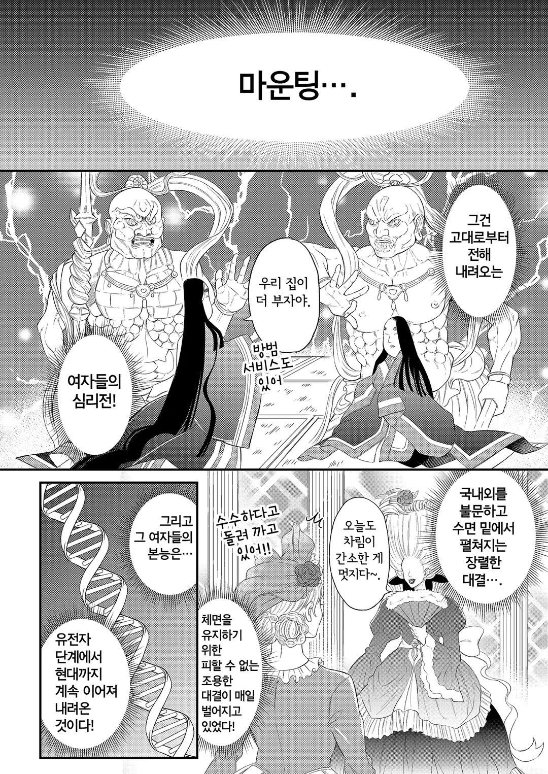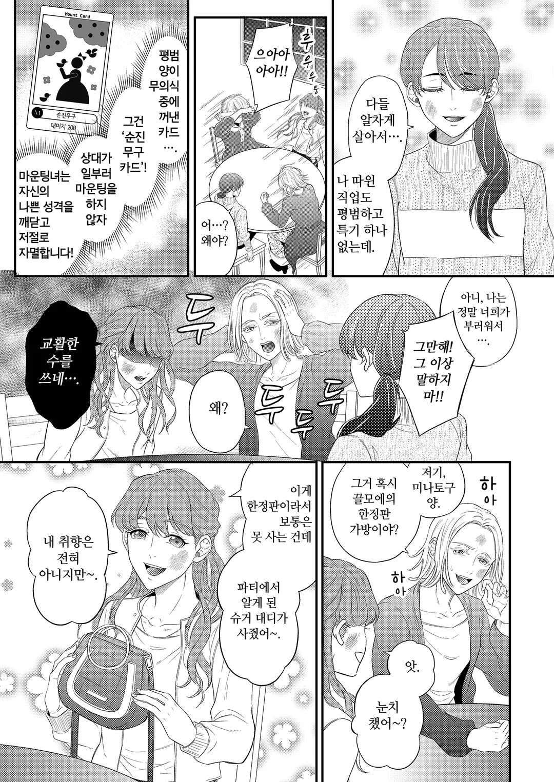 마운팅. 그것은 미소 뒤에서 펼쳐지는 여자들의 목숨을 건 배틀! 각자의 존엄성을 걸고, 그녀들은 오늘도 점심 식사라는 이름의 전장으로 향한다!